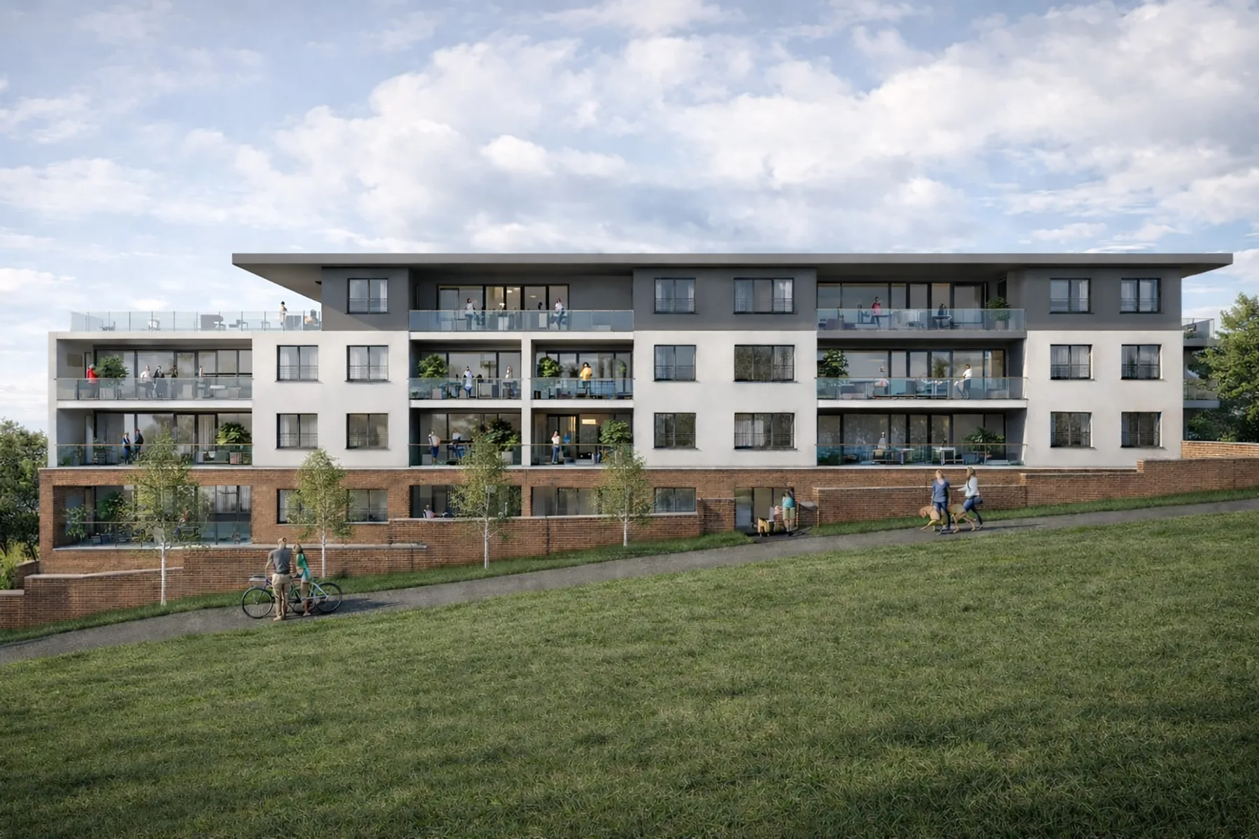 The architectural language combines contemporary detailing with a restrained material palette of brick, render and glazed elements, ensuring the building sits comfortably within its surroundings while maintaining a modern identity. Active frontages and landscaped communal spaces contribute to a welcoming streetscape and encourage social interaction among residents.