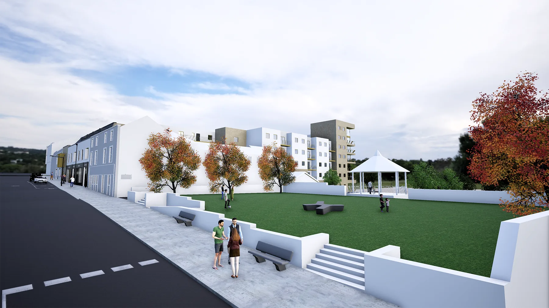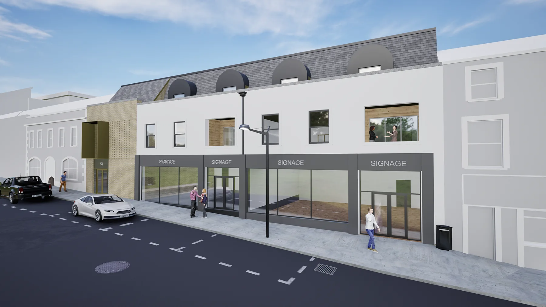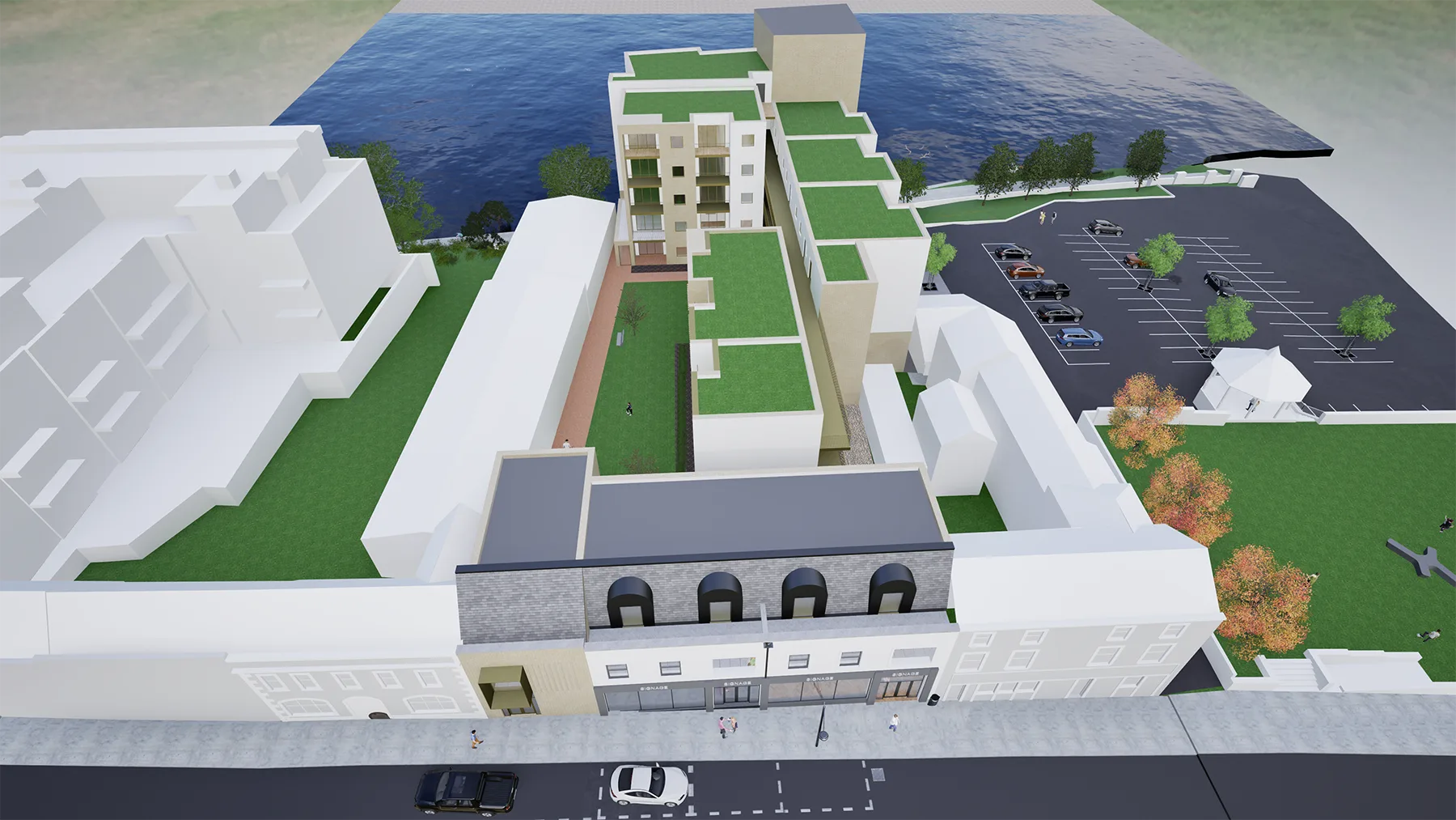This project comprises the construction of a high-density mixed-use development, carefully positioned between the existing town centre main street and the river edge. The scheme delivers active ground-floor retail units fronting the established urban street, with 50 no. apartments arranged above and to the rear, benefitting from long views overlooking the river and surrounding landscape.