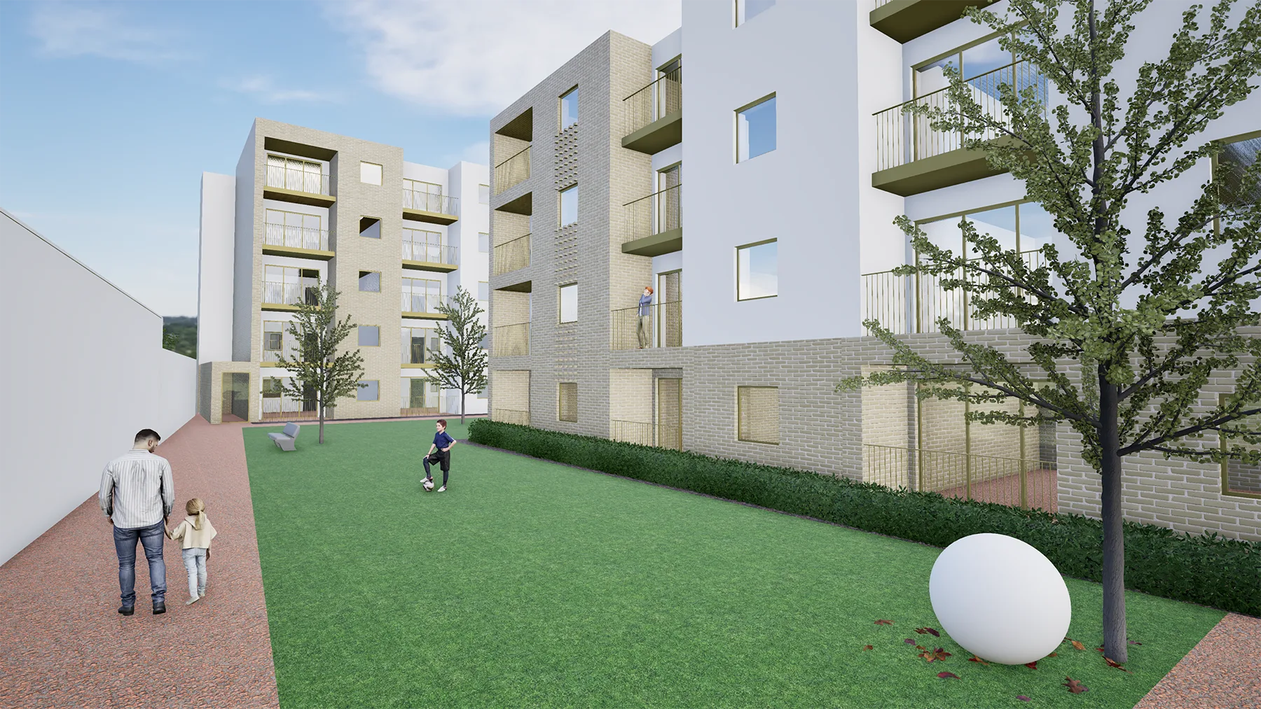 A restrained palette of materials—principally brick, render and metal detailing—has been employed to create a contemporary yet contextually grounded architectural language. Variation in façade treatment, recessed balconies and vertical elements provide depth and shadow, breaking down the overall mass while maintaining coherence across the scheme.