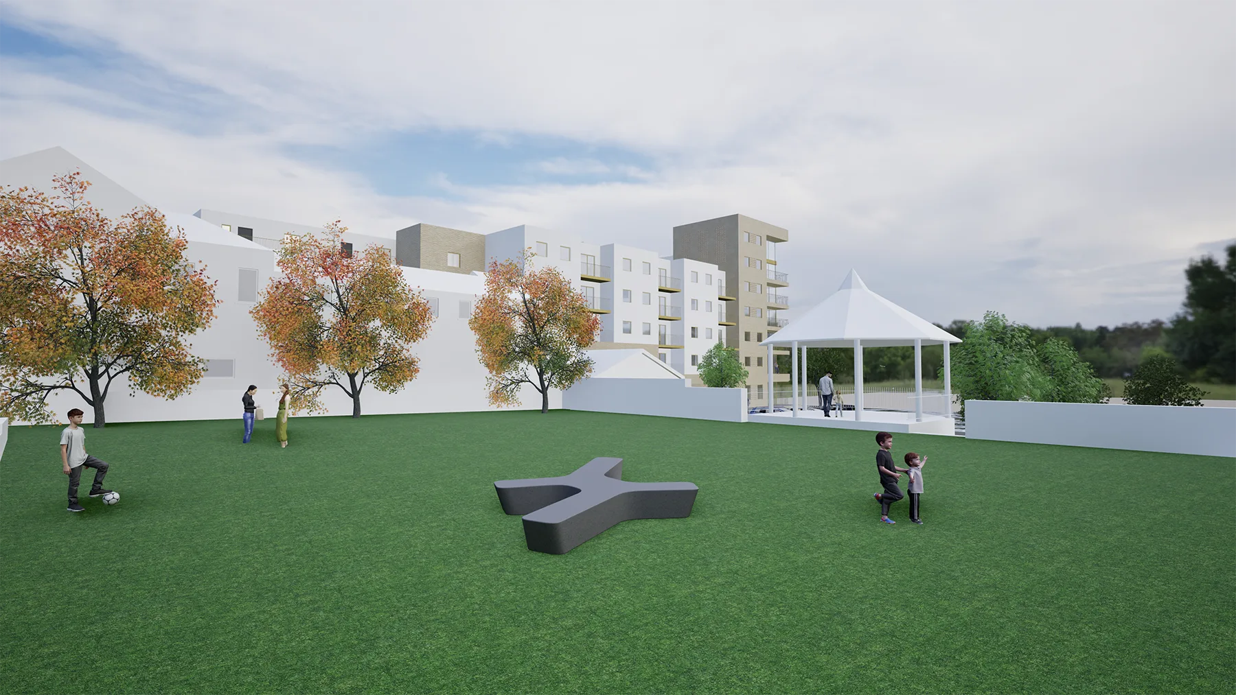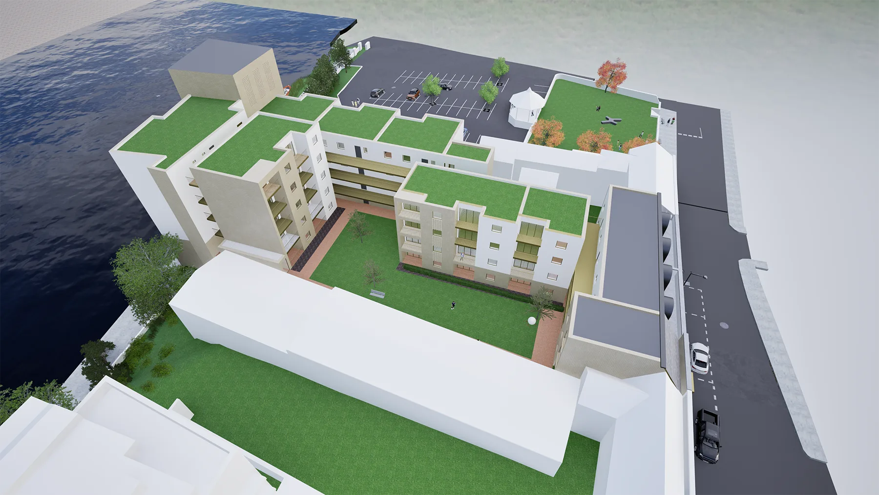 The residential component is organised around shared landscaped courtyards and pedestrian routes, creating sheltered communal spaces that promote social interaction and provide a clear separation from vehicular movement. These external spaces also enhance the residential amenity and contribute to the overall quality of the development.