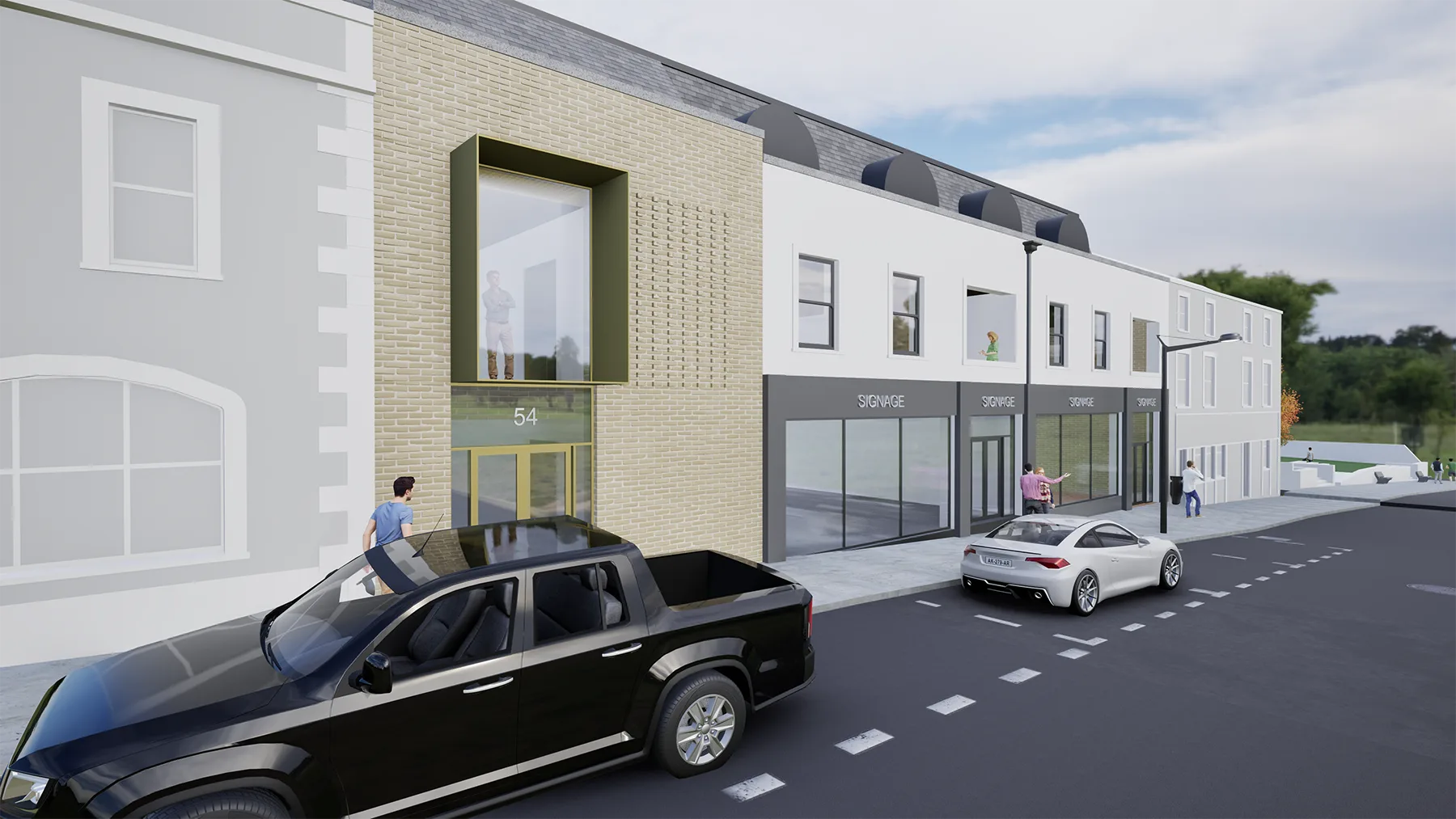 The architectural strategy responds directly to its dual context. Along the main street, the building reinforces the existing urban grain through a strong street edge, vertical rhythm and a robust material palette. Retail units at ground floor provide active frontage and visual engagement at street level, contributing to the vitality and commercial life of the town centre.