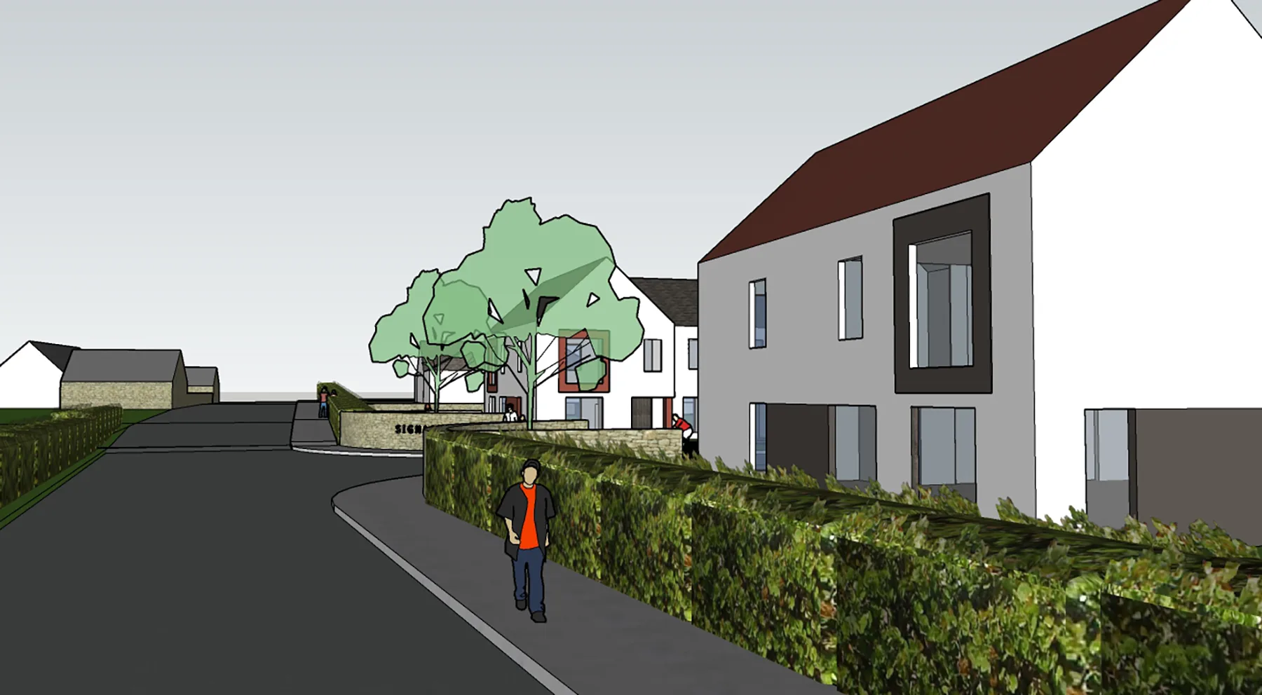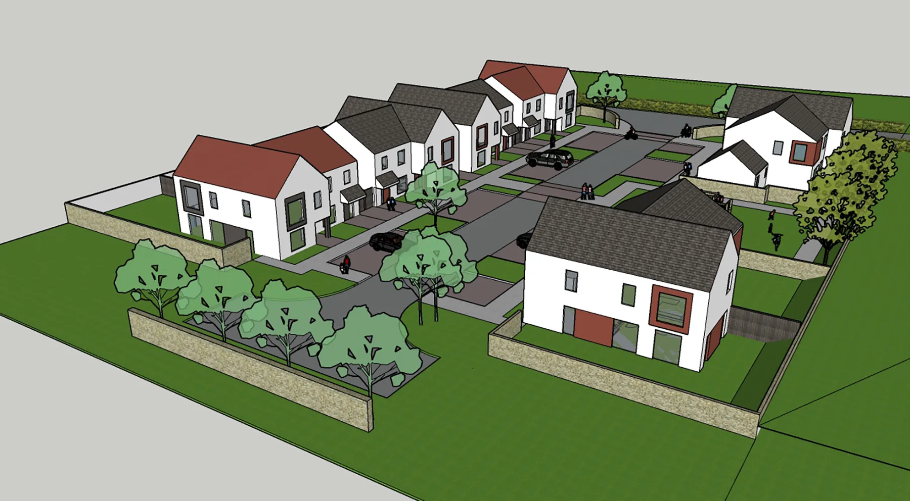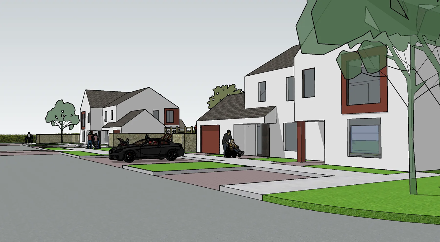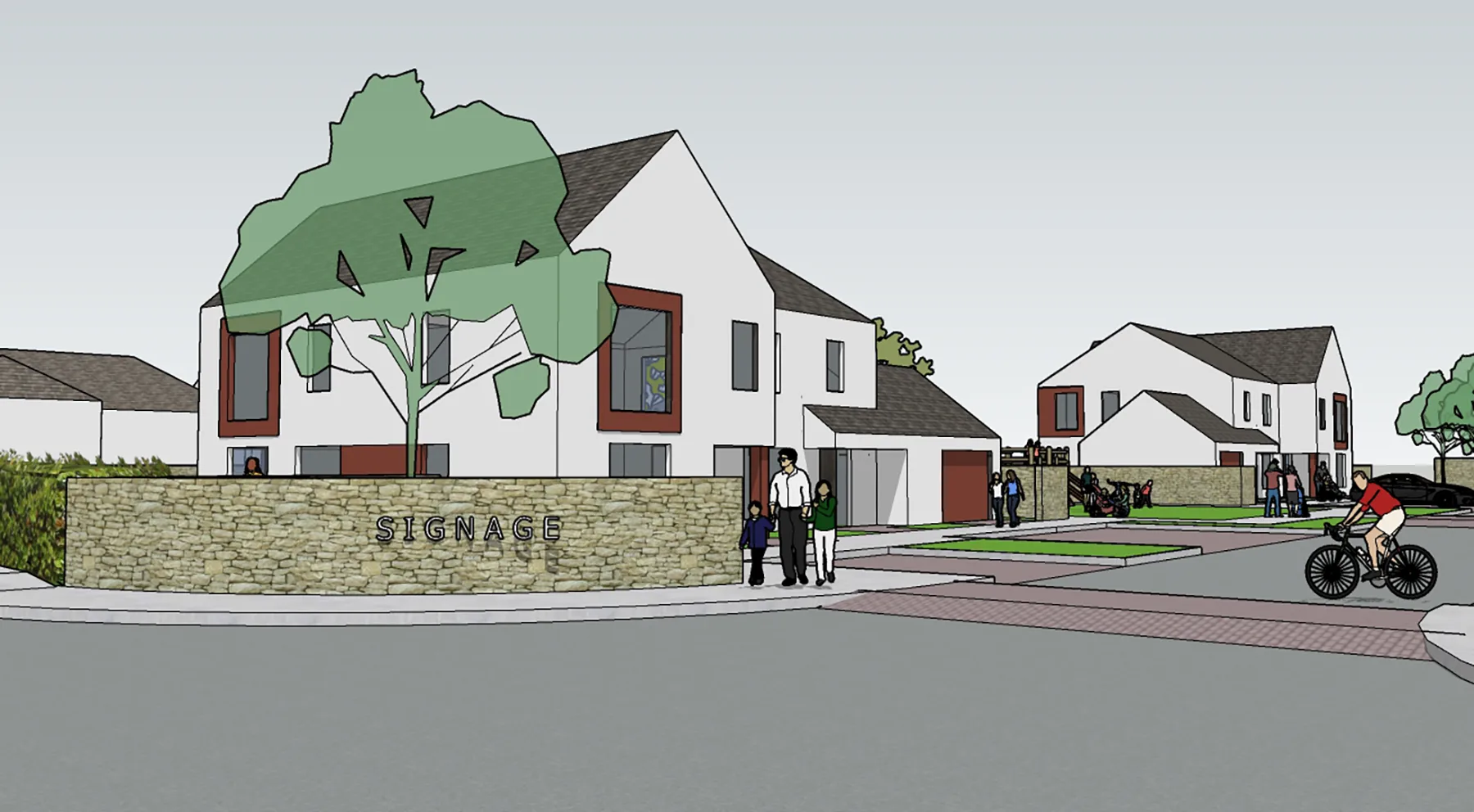 Landscaping plays an integral role in the scheme, with soft green edges, street trees, and private gardens contributing to a gentle transition between buildings and the public realm. The emphasis on pedestrian movement and shared outdoor space fosters a strong sense of community, reflecting the social patterns of traditional rural environments.