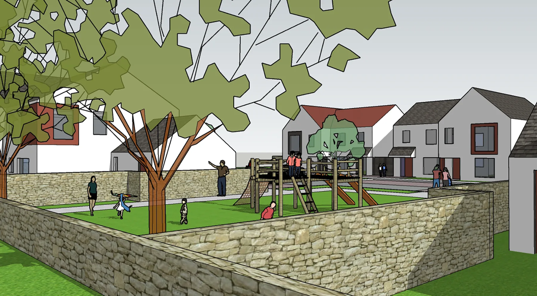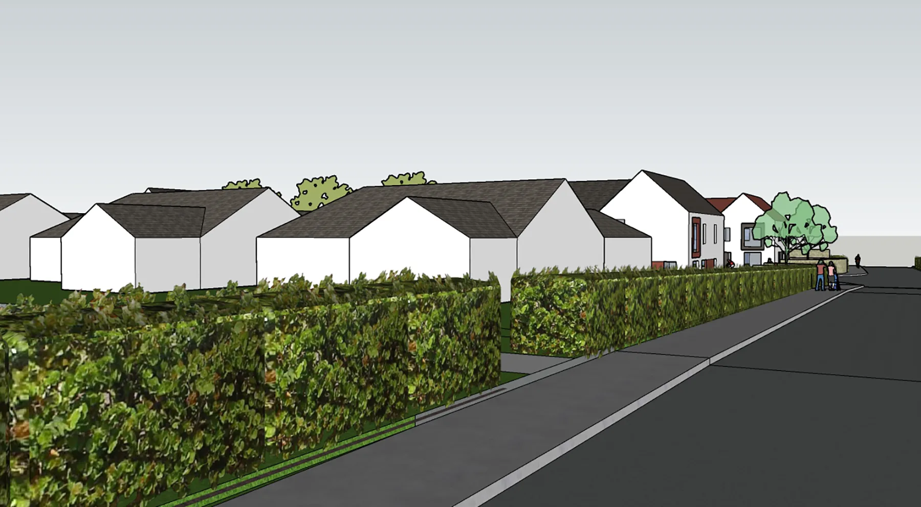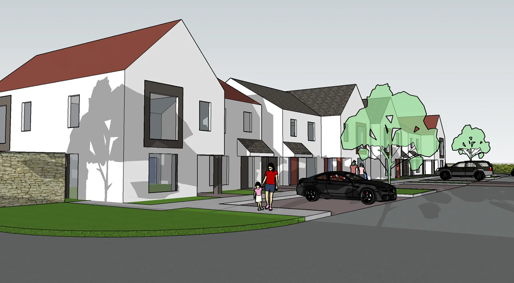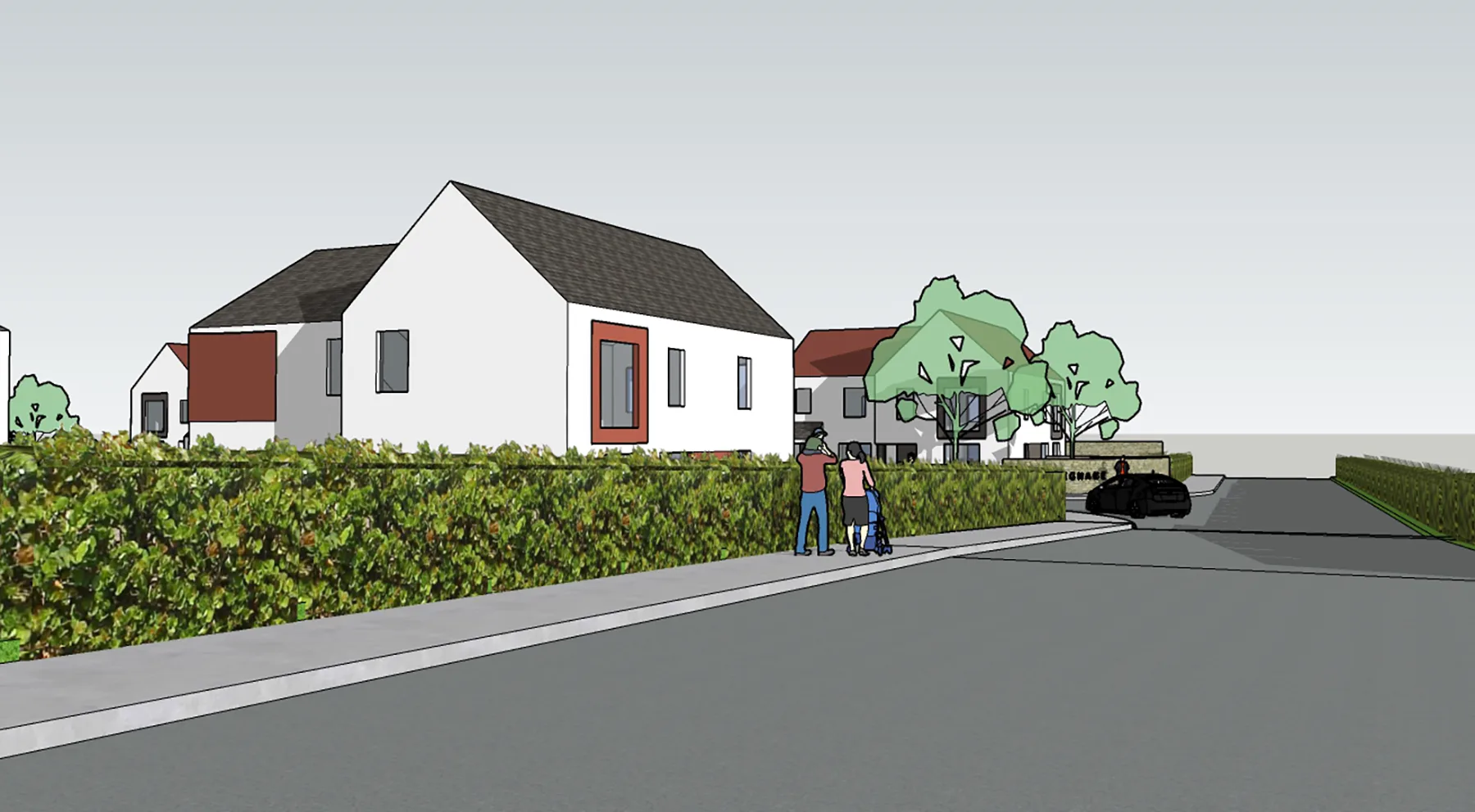 Landscaping plays an integral role in the scheme, with soft green edges, street trees, and private gardens contributing to a gentle transition between buildings and the public realm. The emphasis on pedestrian movement and shared outdoor space fosters a strong sense of community, reflecting the social patterns of traditional rural environments.