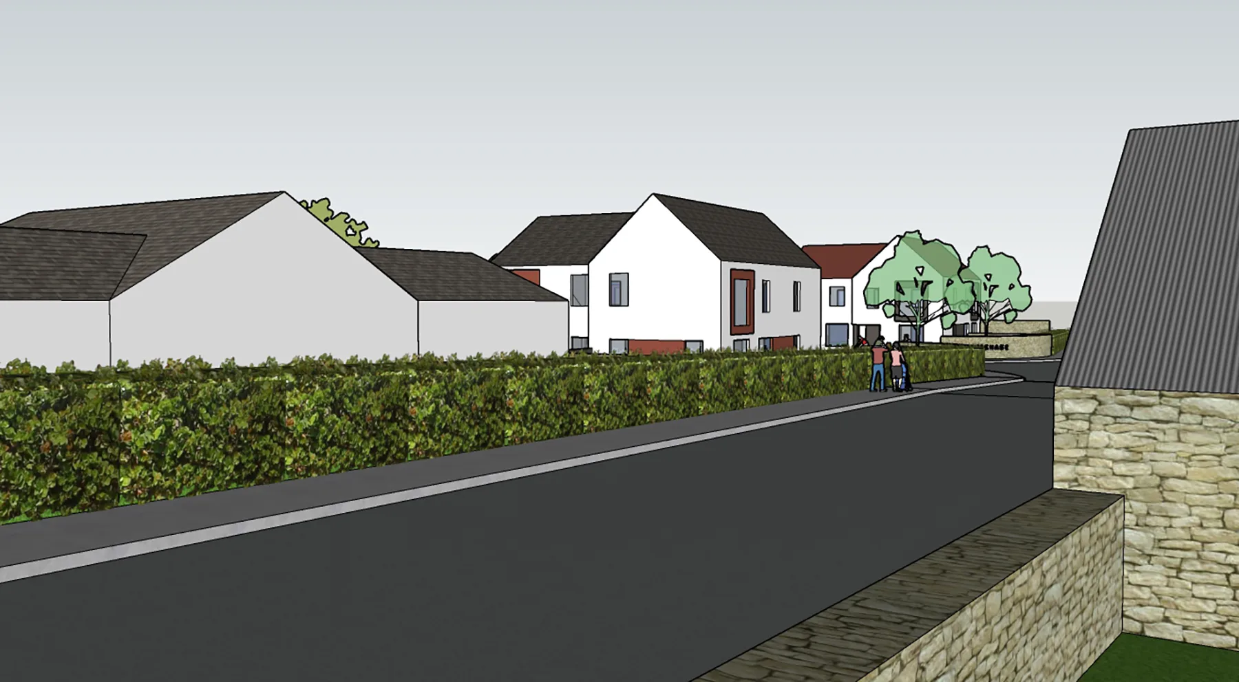 The material palette is deliberately restrained and robust. White render is paired with natural stone boundary walls and darker roof finishes, grounding the development in its rural context. Accents of muted colour around openings provide subtle contrast and help articulate entrances, adding depth and character without disrupting the simplicity of the forms.
