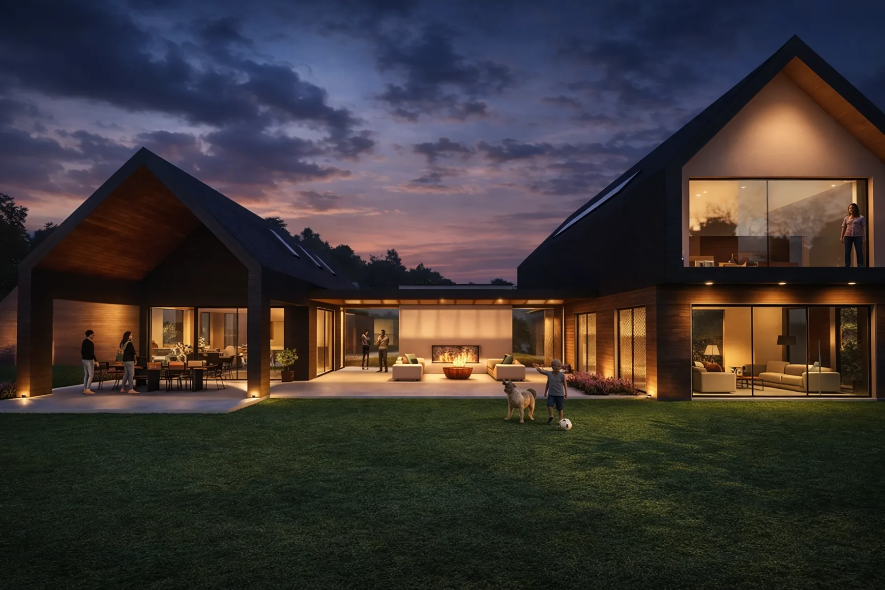 The material palette is restrained and robust, combining dark external finishes with timber accents to create a strong yet understated presence. Generous glazing and outdoor terraces enhance the relationship between the internal and external spaces, resulting in a modern family home that is both grounded and expansive.