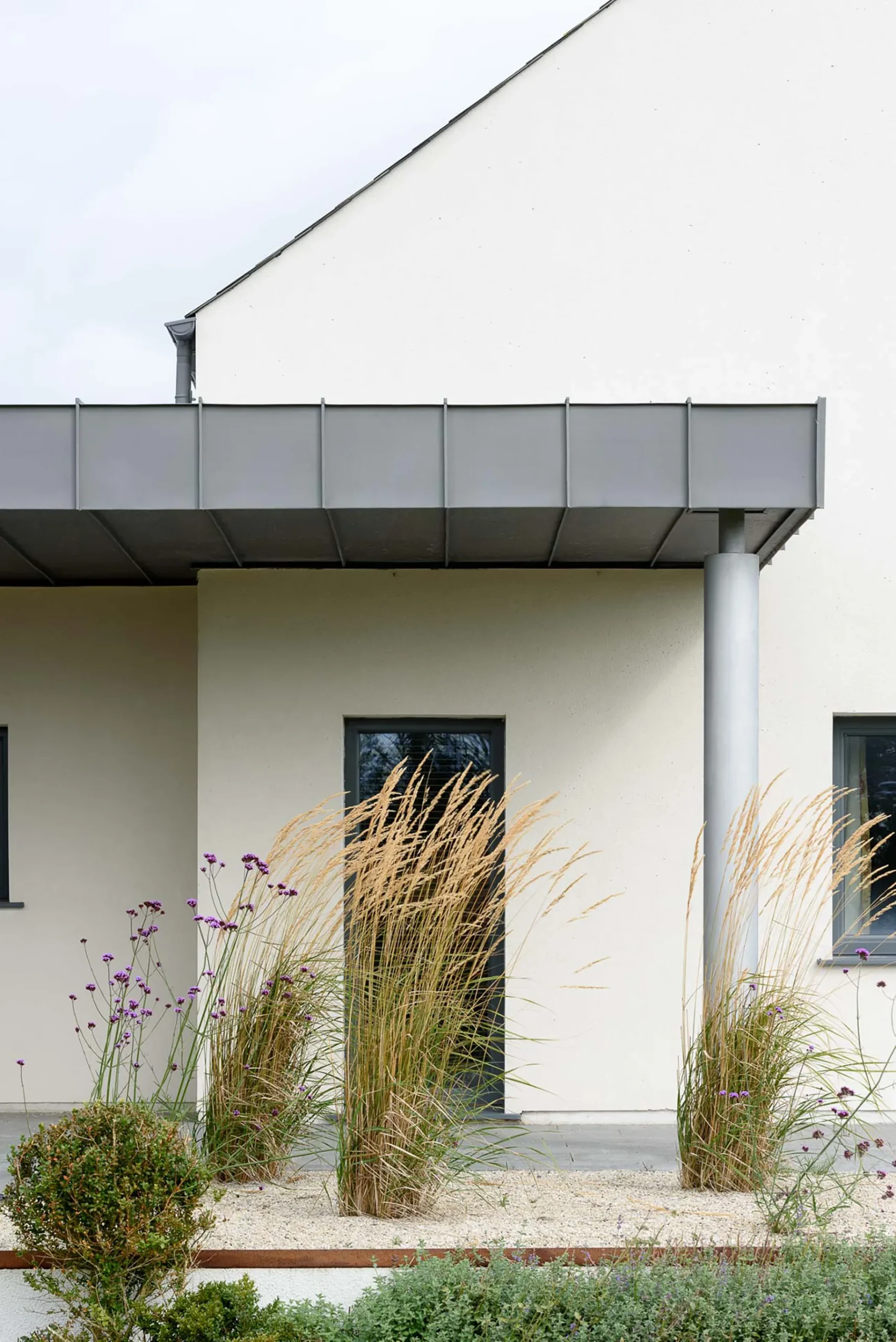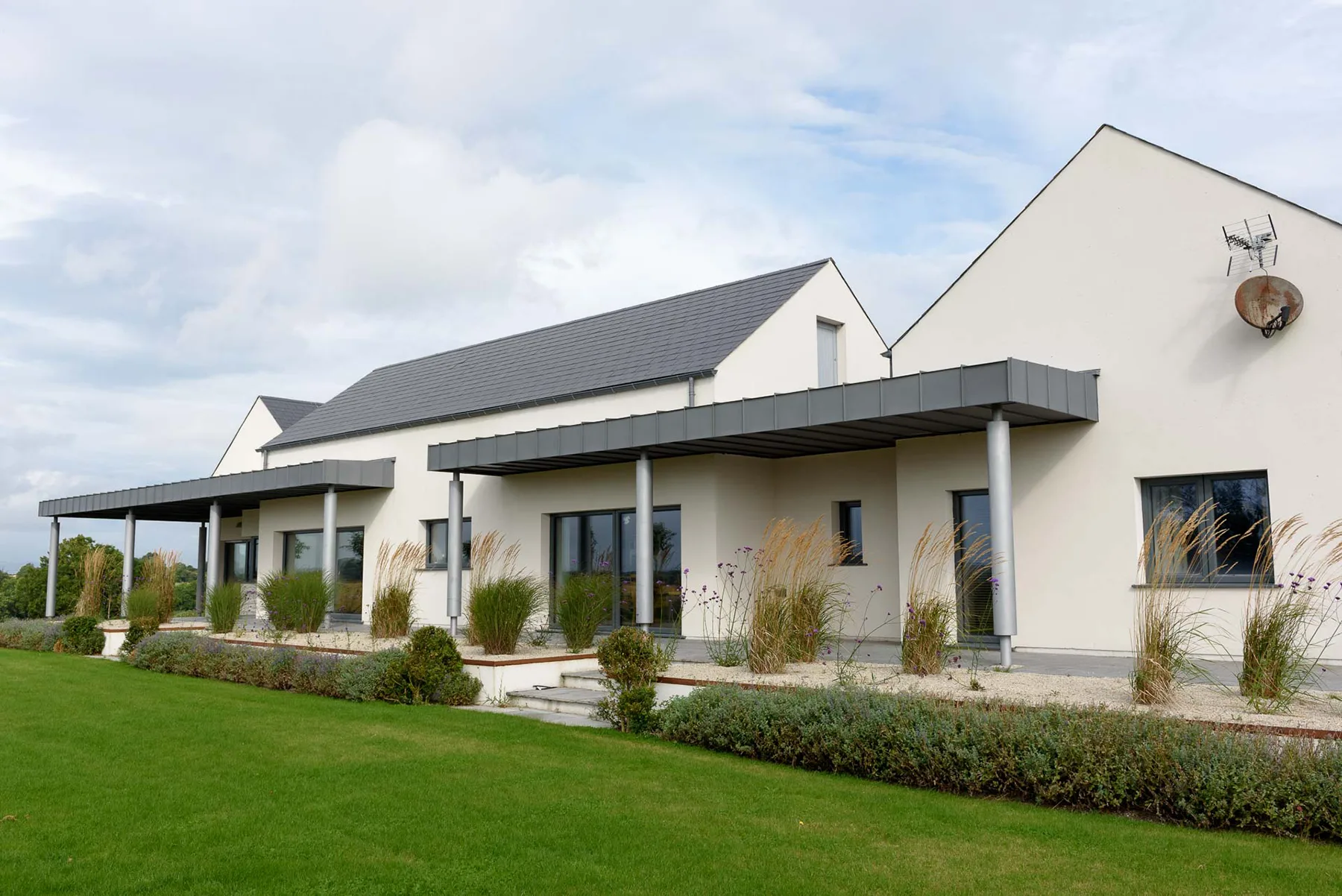 The build method for this 295m2 house design was 300mm wide infill cavity construction walls, raft foundation floor on 400mm wrap insulation, timber A-frame pitched roof, zinc flat roof and triple glazed Passivhaus certified windows. The U-values of these building elements were as low as 0.08 W/m2K.